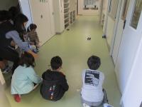 この学習は、ゴムを引っぱったり、ねじったりして、ゴムがものを動かす働きについて調べる学習です。この日は、ゴムの力で動く車を作って、廊下を走らせる実験をしました。
