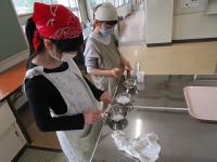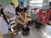 5年生になって家庭科の授業が始まりました。最初、先生やモー君に、家庭科で頑張ることを教わりました。その後は、火を付けたり包丁を洗ったり、計量スプーンを使って砂糖や醤油を計量したりしました。いよいよ次は、ゆで卵作りです。安全に気を付けて、調理をしていきます。